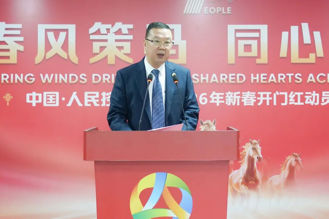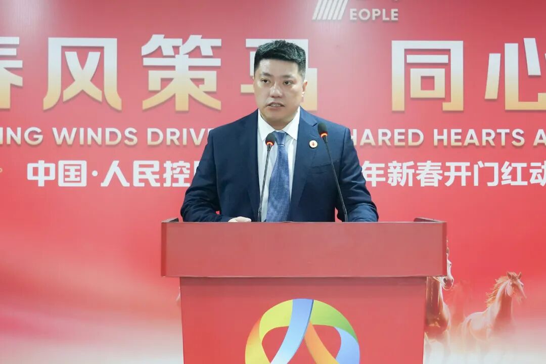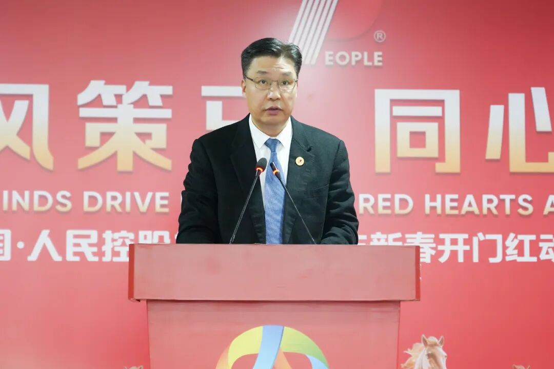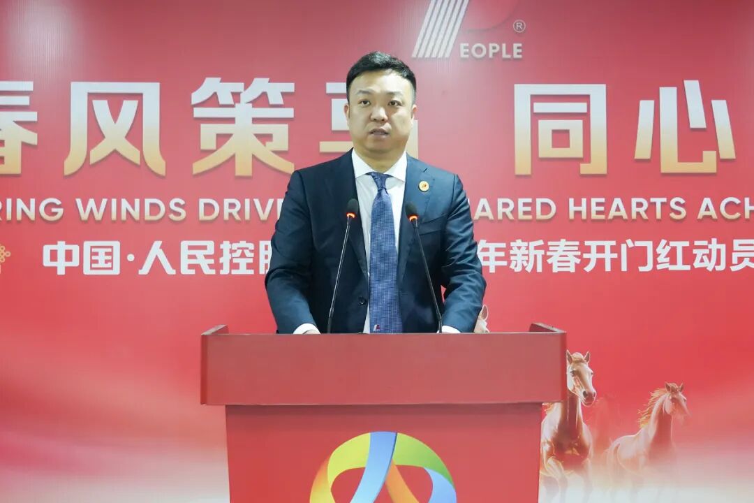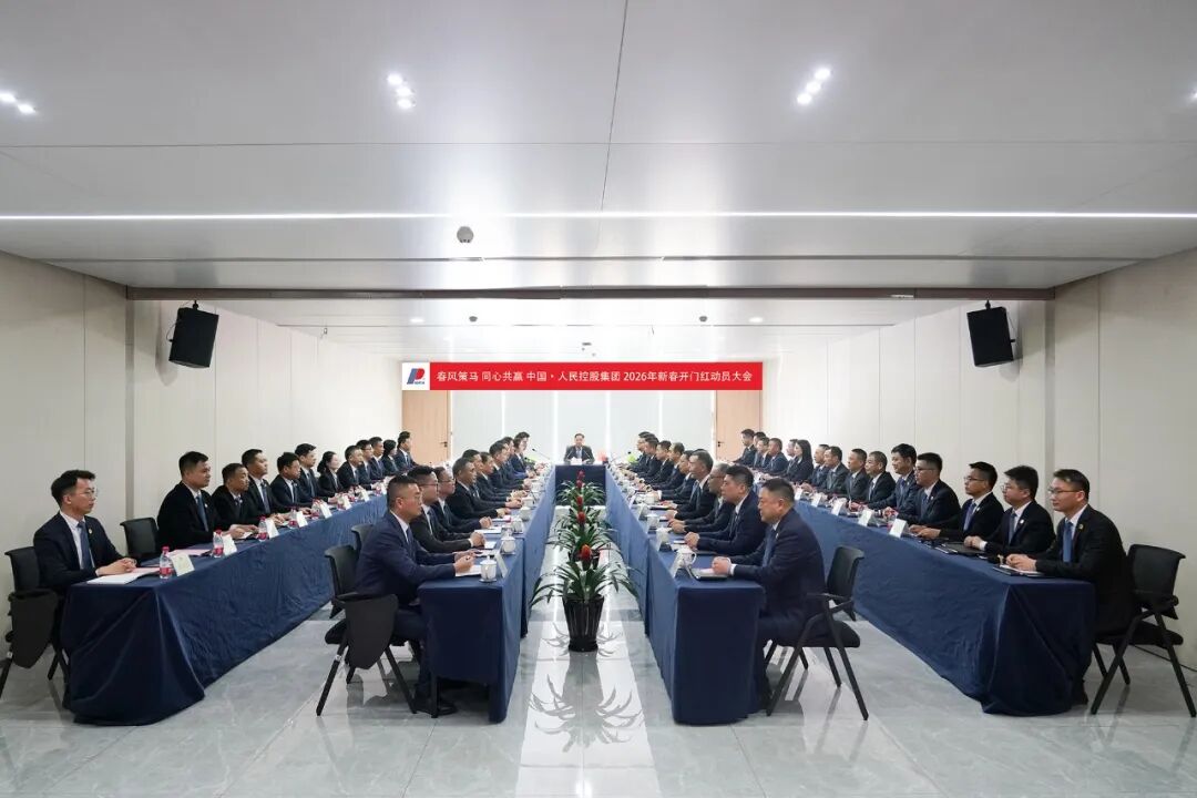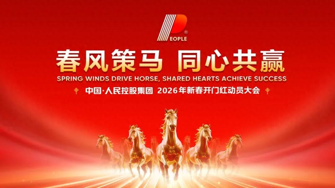 當日,集團2026年新春開門紅大會在溫州總部隆重召開。大會以"春風策馬 同心共贏"為主題,人民控股集團董事長鄭元豹、人民電器集團董事長鄭經潔、人民萬福集團董事長鄭緯宇、人民產業集團董事長陳林鋒、人民金控集團董事長葉向宇、人民控股集團監事長葉林及各板塊負責人齊聚一堂,共商發展大計,共謀嶄新篇章。人民控股集團工會主席、董事辦主任葉小青主持會議。